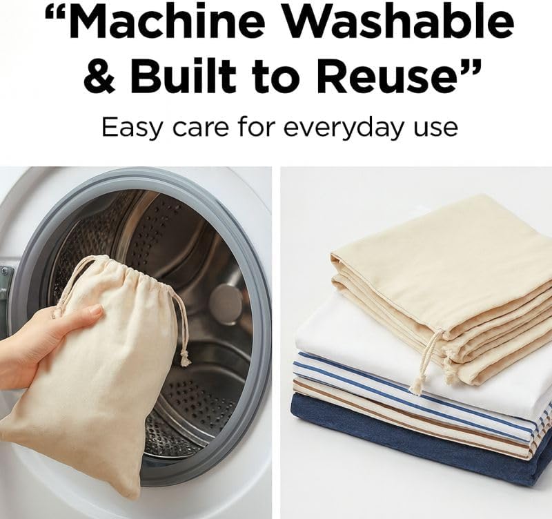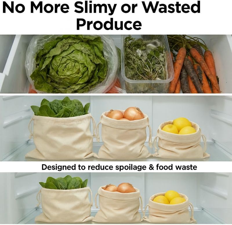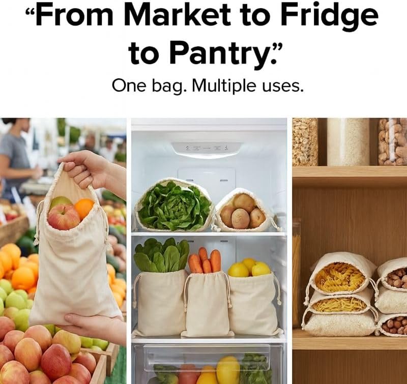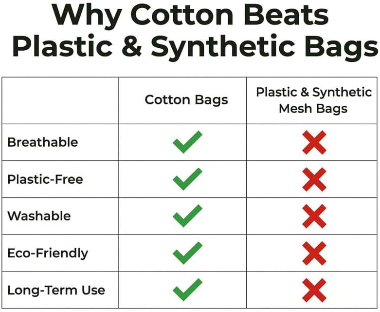 - Breathable 100% Cotton for Fresh Produce-Made from natural cotton fabric that allows airflow, helping reduce moisture and keep fruits and vegetables fresh for longer than plastic storage.